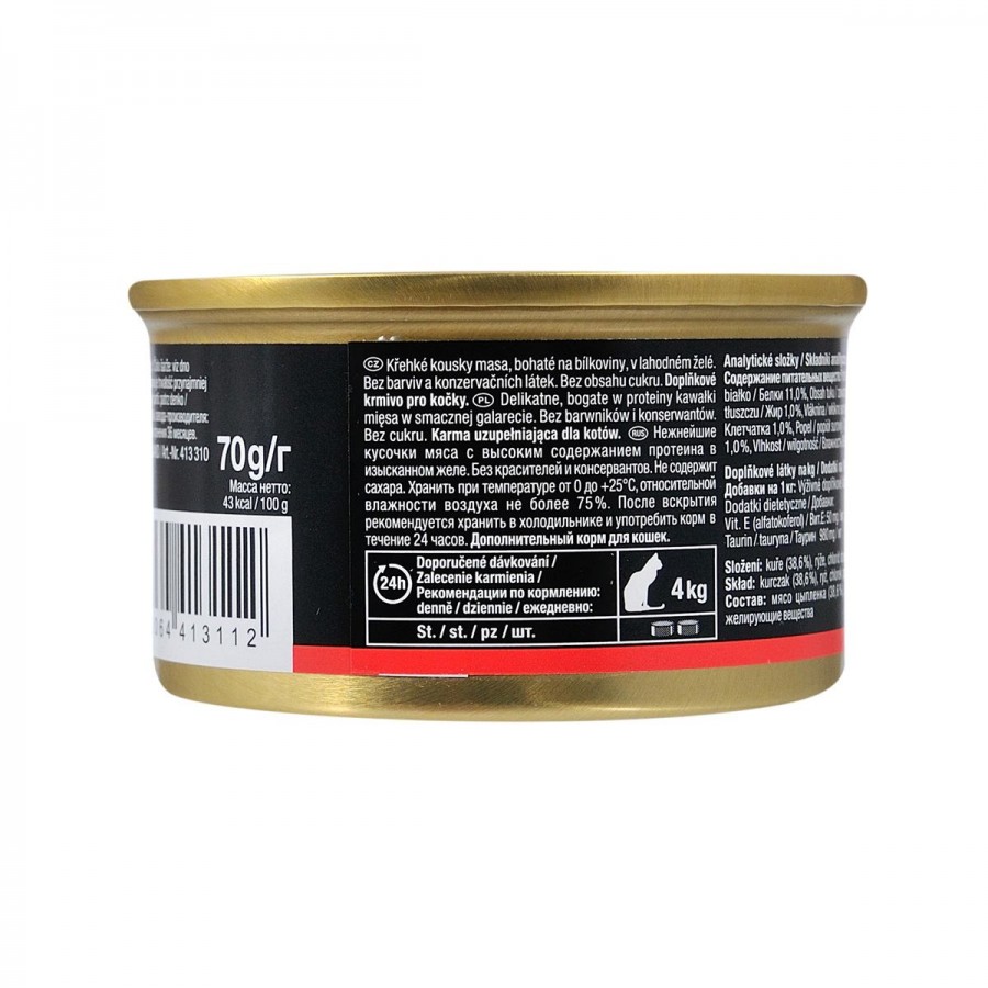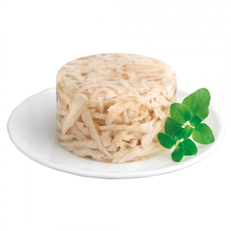 Склад: м’ясо курей, вирощених на волі - 38,6%, желеутворюючі речовини. Не містить барвників та консервантів. Без ГМО.