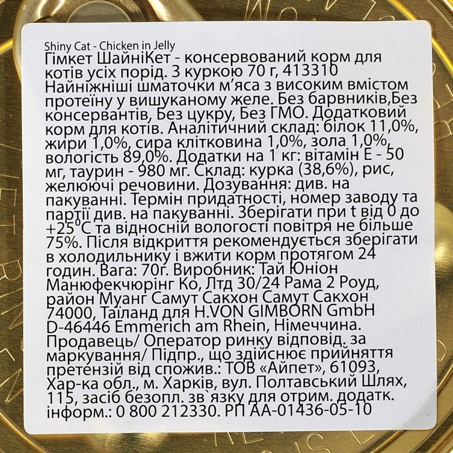 Консерви для котів Shiny Cat курка – делікатесний вологий корм, готовий до споживання. Виготовлений з високоякісного м’яса курки. Не містить штучних барвників, підсилювачів смаку, консервантів і ГМО.