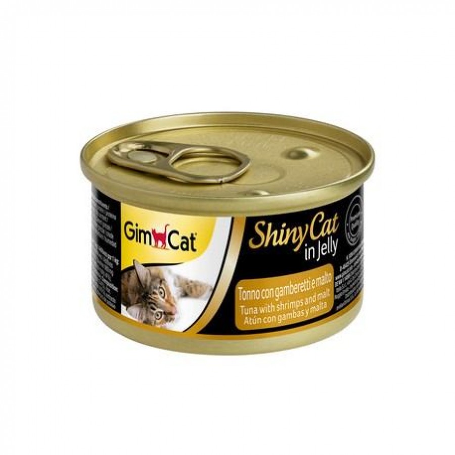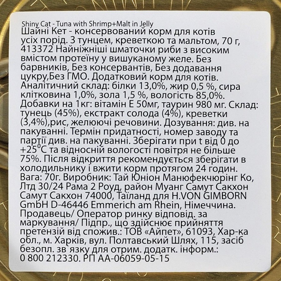 Консерви для котів Shiny Cat тунець, креветки та солод – делікатесний вологий корм, готовий до споживання. Виготовлений з високоякісного м’яса тунця і креветок. Не містить штучних барвників, підсилювачів смаку, консервантів і ГМО.