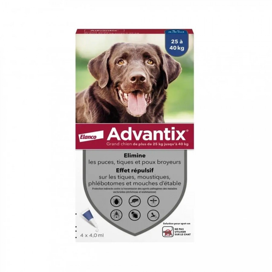 - для собак від 25 кг до 40 кг: об’єм 4,0 мл; Імідаклоприд (мг/кг маси тіла) 10–16; Перметрин (мг/кг м.т.) 50–80.