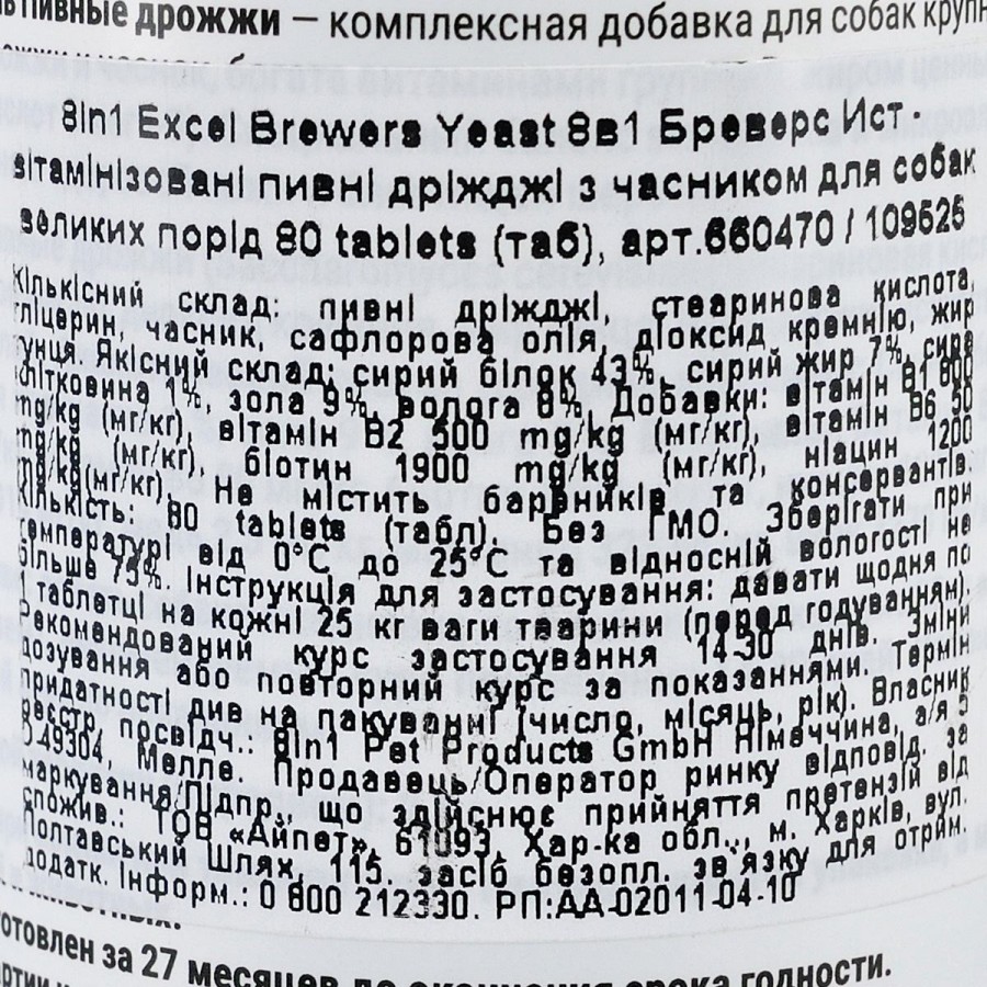 Excel Brewers Yeast - це добавка, спеціально розроблена для підтримки шкіри і шерсті собак і кішок. Комплекс містить пивні дріжджі, багаті вітамінами групи В, часник, вітаміни (такі як, наприклад, біотин) і мікроелементи (в т. ч. мідь, цинк). У комбінації з цінним риб'ячим жиром, джерелом жирних кислот омега-3, ця добавка сприяє поліпшенню стану шкіри і шерсті. Крім того, пивні дріжджі нормалізують обмін речовин, стабілізують роботу внутрішніх органів і активізують імунну систему.