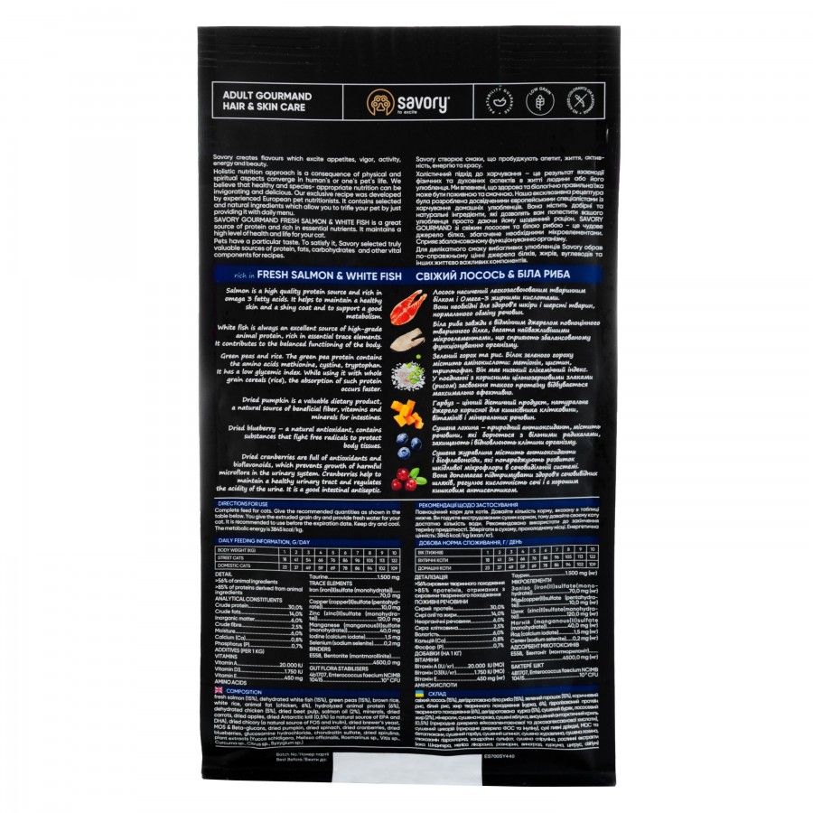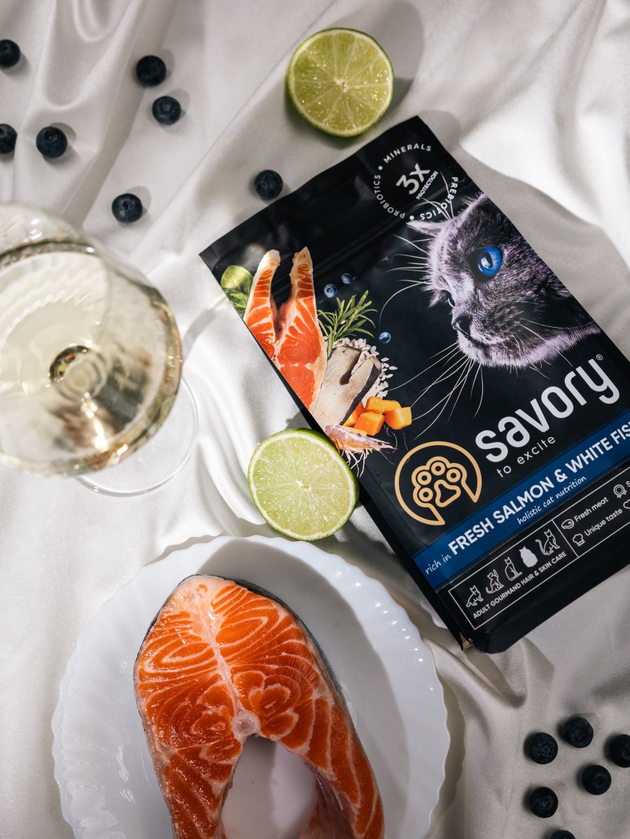 Сухий корм для котів Savory містить свіже м'ясо лосося і дегідроване м'ясо білої риби, ягоди, фрукти та овочі. Ці компоненти створені природою, щоб забезпечити збалансоване функціонування організму котика та надати його шерсті надзвичайного вигляду.