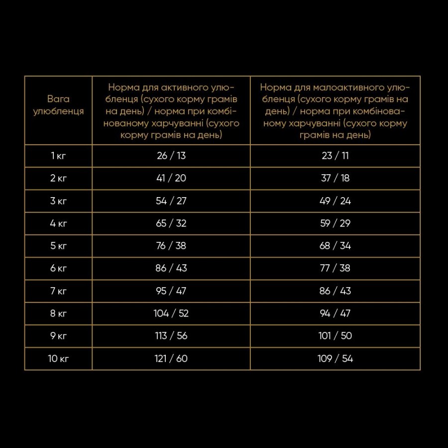 Вага улюбленця | Норма для активного улюбленця (сухого корму грамів на день) / норма при комбінованому харчуванні (сухого корму грамів на день) | Норма для малоактивного улюбленця (сухого корму грамів на день) / норма при комбінованому харчуванні (сухого корму грамів на день) |