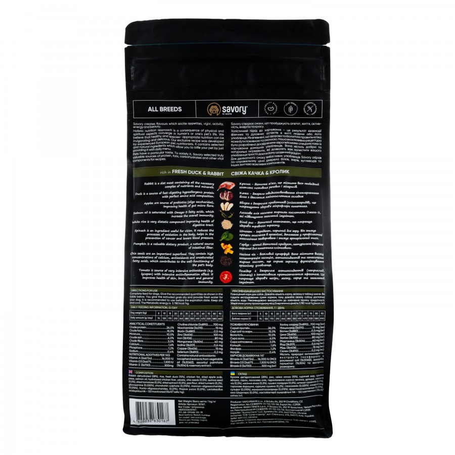 Сухий корм для собак усіх порід Savory містить якісне м’ясо качки та кролика, суперфуди, яблука, гарбуз і куркуму. Ці компоненти створені природою для оптимальної кондиції, здорових суглобів і розкішного вигляду песика.