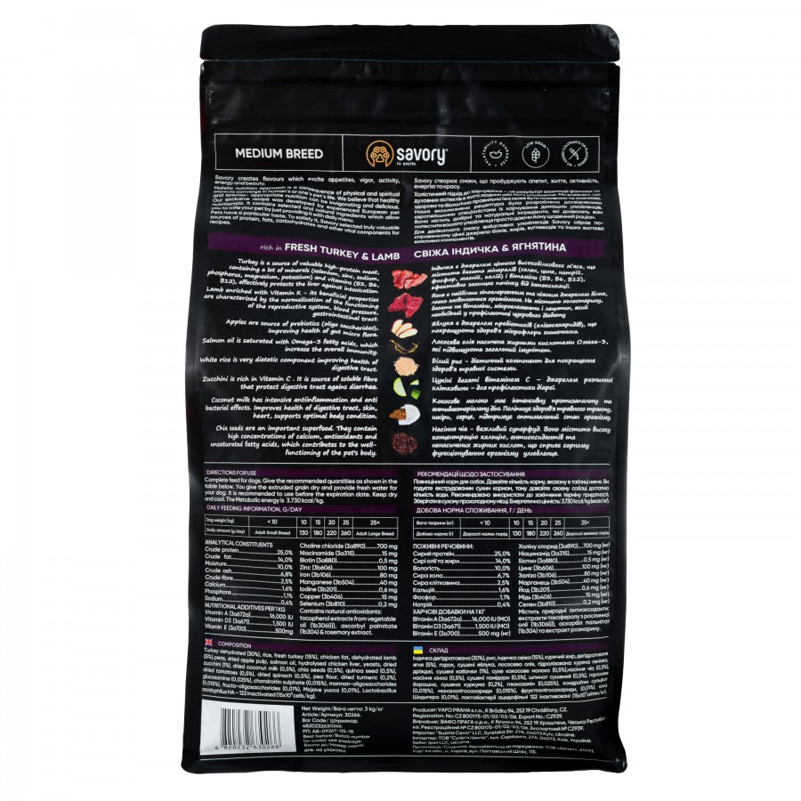Сухий корм для собак середніх порід Savory містить 50 % якісного м’яса індички та ягняти, суперфуди, цукіні, шпинат і помідори. Ці компоненти створені природою для завжди бадьорого і життєрадісного песика.