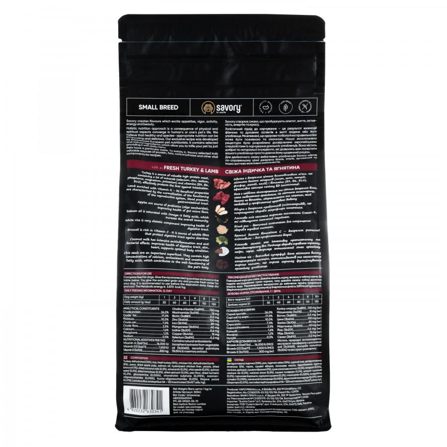 Сухий корм для собак малих порід Savory містить 53% якісного м’яса індички та ягняти, суперфуди, яблука, броколі, шпинат. Ці компоненти створені природою для невеличкого, але дуже активного песика. Гранули корму розроблені з урахуванням анатомічних особливостей собак малих порід.