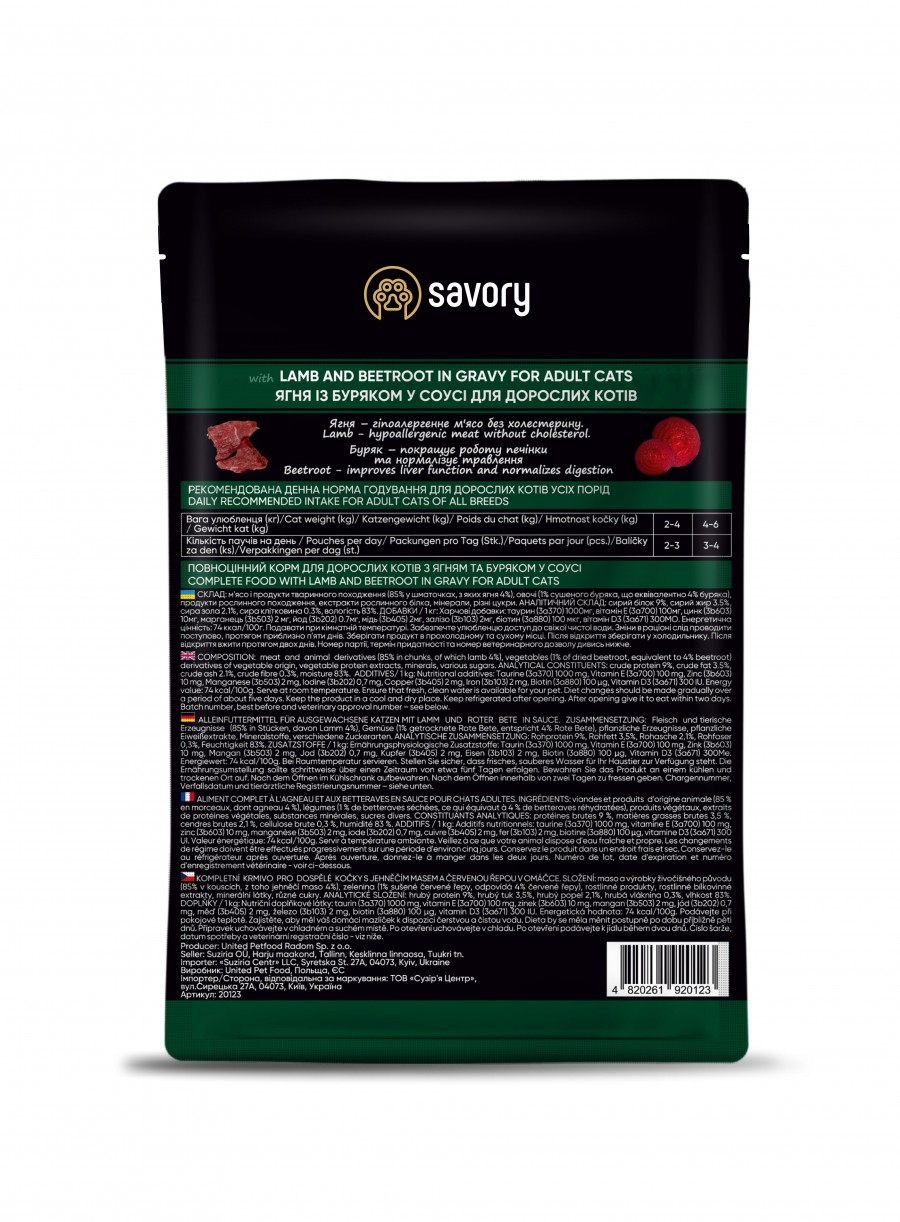 Повноцінний вологий корм суперпреміум класу для дорослих котів "Savory шматочки ягняти з буряком в соусі". Для самостійного або комбінованого із сухим кормом харчування улюбленців старше 1 року.