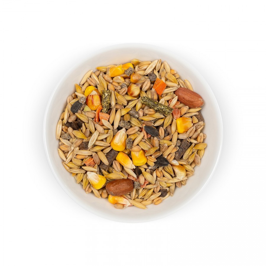 Склад: горохова крупа, комбікорм, кукурудза, овес, сорго, арахіс, насіння соняшнику, гречка, яблука сушені гранульовані, пшениця, ячмінь, сушена морква, трав’яне борошно гранульоване в асортименті.
