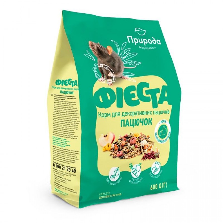 Пацючки мають харчуватися різноманітно, тому до складу корму включені маїс, сушені овочі та фрукти, насіння гарбуза та соняшнику, просо, овес, ягоди. Таким чином улюбленець отримує калій, кальцій, цинк, залізо, магній та вітаміни, необхідні для міцного імунітету, тривалого життя та гарного зовнішнього вигляду.