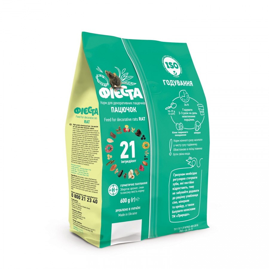 Рецептура корму розроблена спеціально для пацючків та інших середніх гризунів, які утримуються в домашніх умовах. Вона складена у відповідності до рекомендацій ветеринарів та фахівців з розведення гризунів.