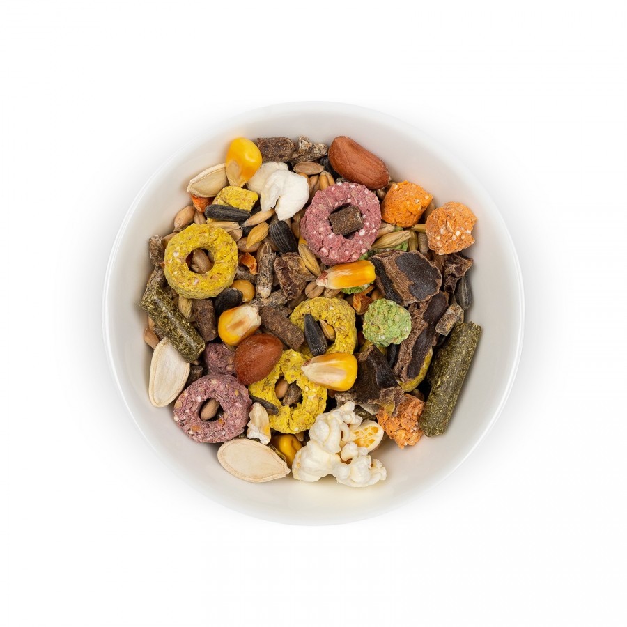 Склад: ячмінь, крупа горохова, насіння соняшнику, кукурудза, арахіс, яблуко сушене гранульоване, горобина, пшениця, насіння гарбуза, фруктово-зерновий гранулят, овочево-зерновий гранулят, злаково-трав’яний гранулят, трав’яний гранулят в асортименті, сушена морква, кероб подрібнений, попкорн, комбікорм, овес голозерний.