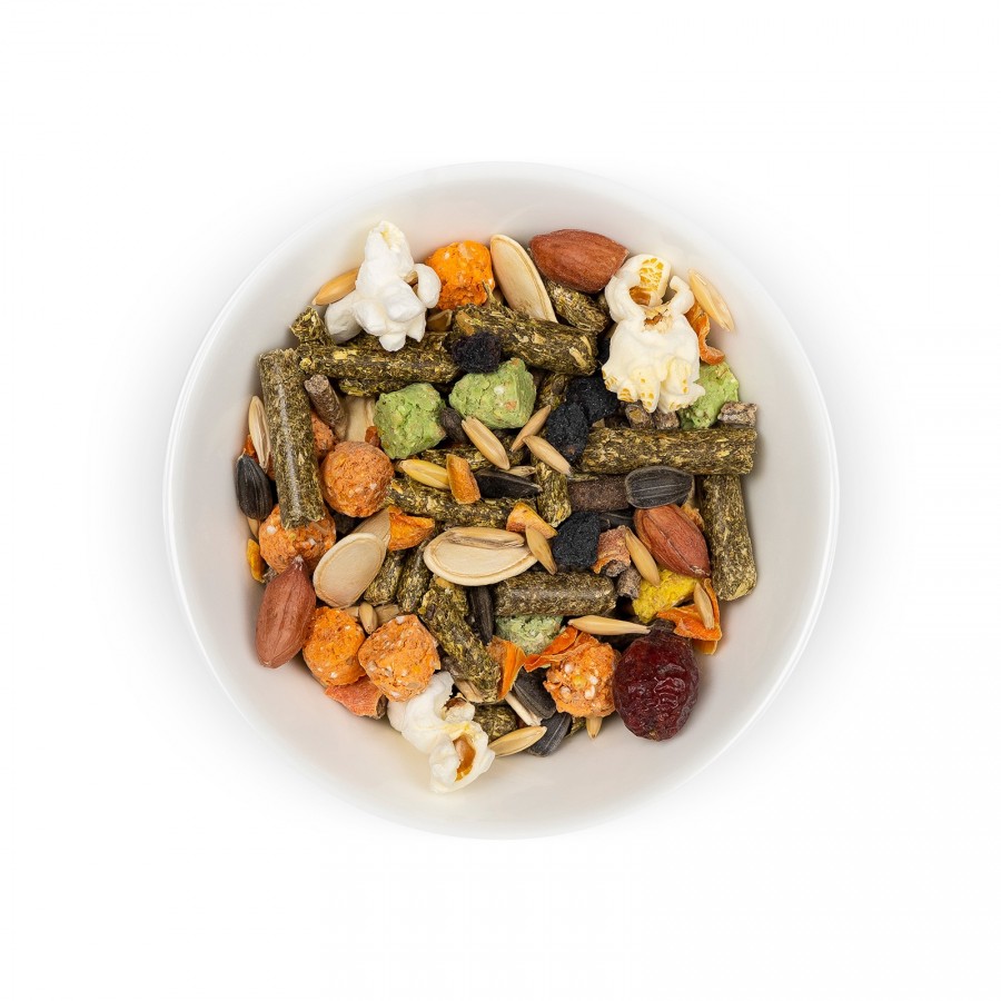 Склад: пшениця, крупа горохова, шипшина, горобина, трав’яний гранулят в асортименті, яблуко сушене гранульоване, сушена морква, насіння соняшнику, арахіс, насіння гарбуза, фруктово-зерновий гранулят, овочево- зерновий гранулят, злаково-трав’яний гранулят, кероб подрібнений, попкорн, овес, овес голозерний, комбікорм.