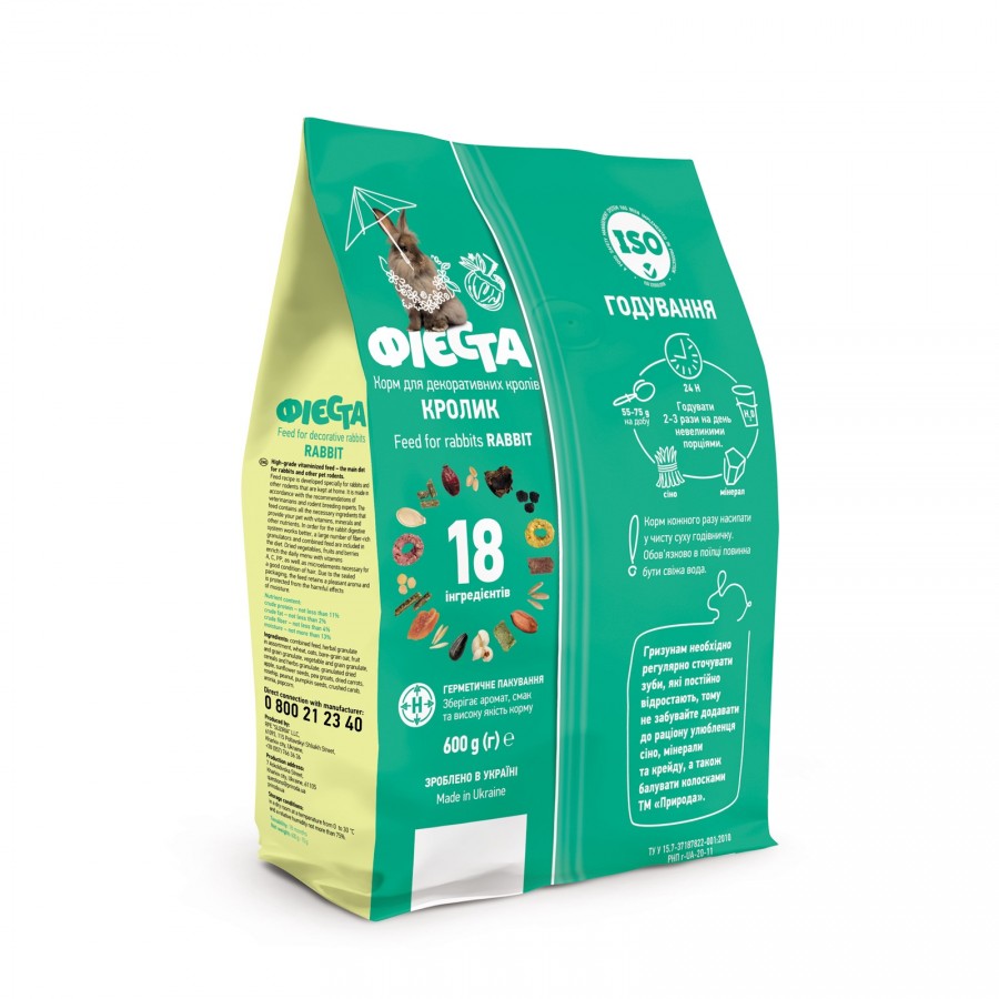 Корм містить всі необхідні компоненти, які забезпечують улюбленців вітамінами, мінералами та іншими корисними речовинами. Для того, щоб система травлення кроликів працювала краще, до раціону включено велику кількість гранулятів та комбікорму, багатих клітковиною.