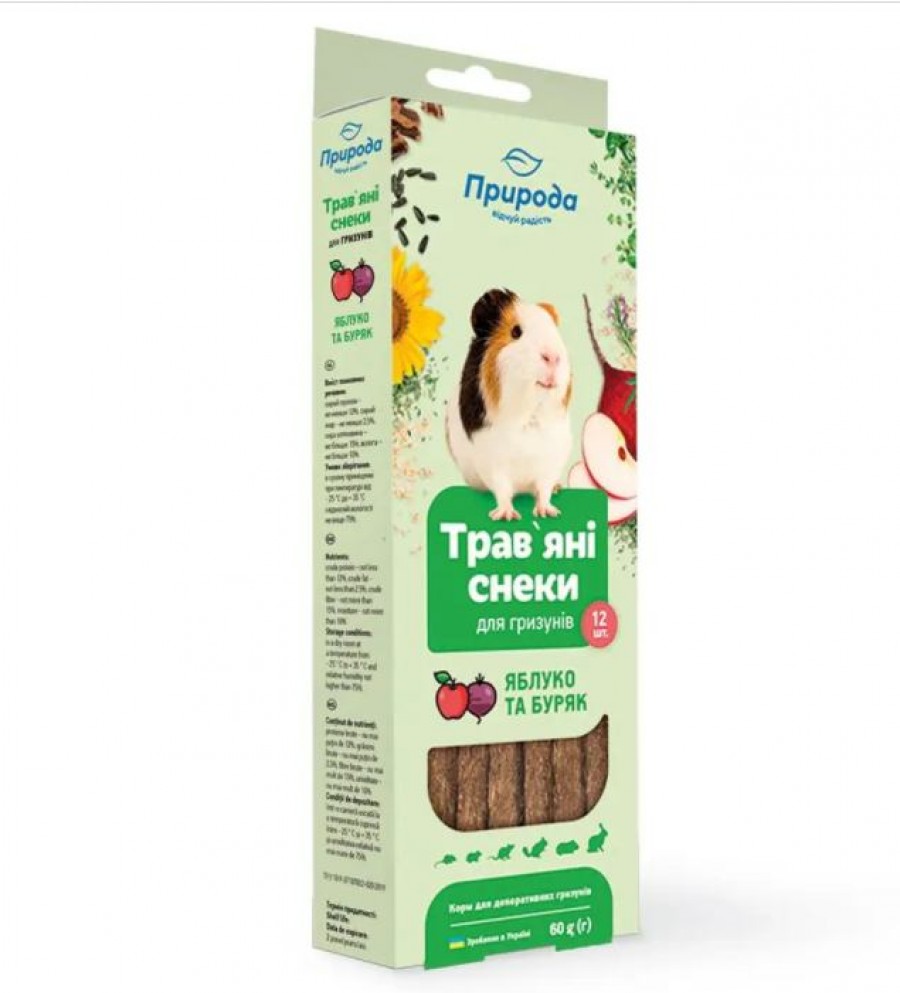 Снеки збагачують раціон ваших улюбленців корисними речовинами, рослинними волокнами, які необхідні для гризунам для постійного сточування зубів. Ласощі виготовлені виключно з натуральних компонентів, не містять цукру, штучних барвників і ароматизаторів.