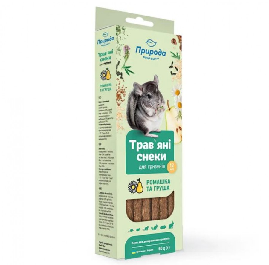 Склад: трав`яна січка, вівсяні пластівці, груша сушена, крупа горохова, кероб, насіння соняшнику, насіння льону, квітки ромашки.