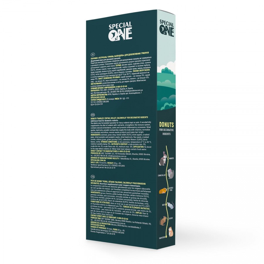 Склад: вівсяна крупа, трав’яна січка, чумиза (10,1%), яблука сушені, горох, гарбуз сушений, буряк сушений, насіння льону, кероб, цикорію трава, зелень петрушки сушена (1,4%), квіти календули (0,81%), листя берези, кропива.