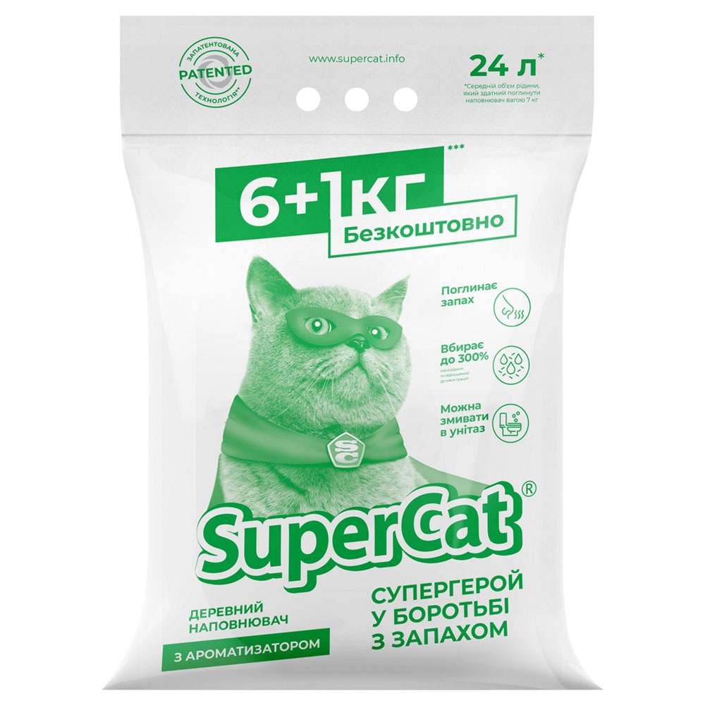 Завдяки своїй екологічності гранули Super Cat підходять для кошенят. Використаний наповнювач легко утилізується за допомогою змивання в унітаз. Super Cat — ідеальне рішення для власників, які надовго залишають улюбленців вдома одних. Купуючи цей наповнювач, ви отримуєте в подарунок 1 кг. Цього об'єму буде досить для одного кота приблизно на два місяці використання.