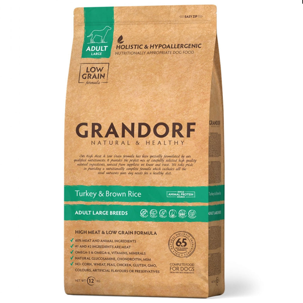 Сухий корм Grandorf з індичкою та коричневим рисом стане улюбленим харчуванням дорослих собак великих порід. В основі корму тільки одне джерело білку та вуглеводів, яких особливо потребують собаки з чутливим травленням або алергією. Склад корму оптимально збалансований вітамінами, мінералами та мікроелементами для загального зміцнення здоров'я та забезпечення тварин потрібним рівнем енергії. При щоденному харчуванні собак цим продуктом, підтримується правильна робота шлунка та стабілізується мікрофлора.