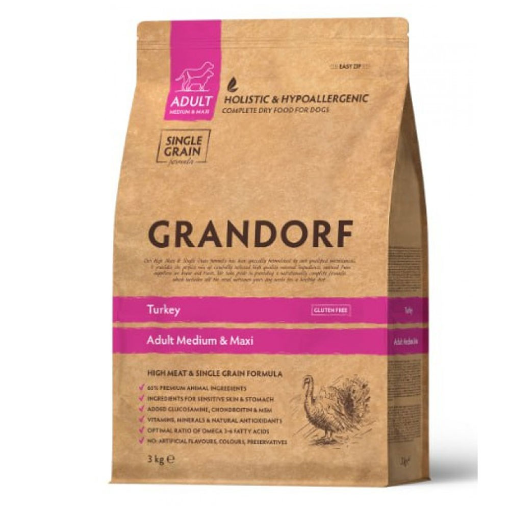 Grandorf Turkey Adult Adult Medium & Maxi Breeds - високоякісний корм для дорослих собак середніх і великих порід. Гіпоалергенна формула ідеально підходить вихованцям з чутливим травленням або схильним до алергії.