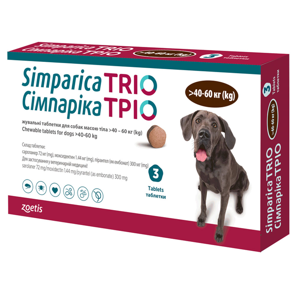 Жевательные таблетки против блох и клещей для собак Zoetis Simparica ТРІО (Симпарика ТРІО) весом от 40.1 до 60 кг 3 таблетки