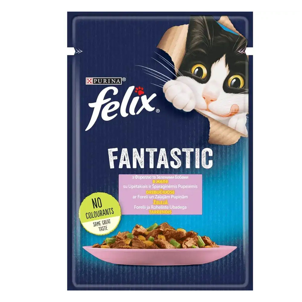 Апетитні шматочки з фореллю та зеленими бобами в желе для дорослих котів. Це збалансований раціон, що забезпечує організм улюбленця необхідними поживними речовинами.
