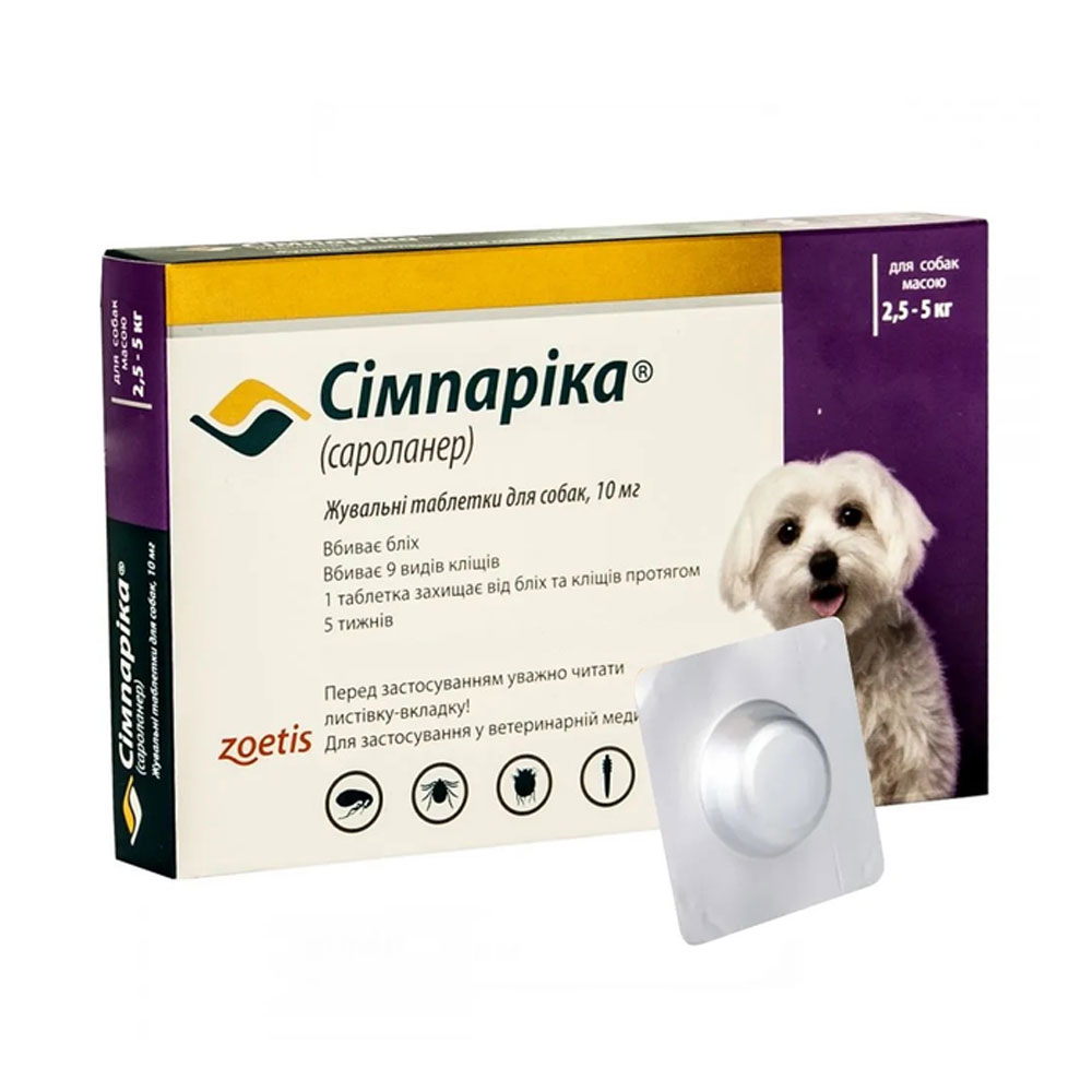 Жувальні таблетки Zoetis Сімпаріка Тріо проти бліх та кліщів для собак вагою від 20.1 до 40 кг, ціна за 1 таблетку Червонувато - коричневі п'ятикутні таблетки з закругленими краями. Таблетки мають з однієї сторони тиснення, яке вказує кількість сароланеру у таблетці. Застосування Препарат призначений для пероорального застосування. Собака може приймати таблетку з їжею так і без. Таблетки Сімпаріка ТРІО приємні на смак і легко споживаються більшістю собак, коли їх пропонує власник. Таблетки не потрібно ділити. Препарат слід застосовувати тільки у собак, коли одночасно показано лікування кліщів /бліх і шлунково-кишкових нематод. При відсутності ризику змішаної ко-інфекції слід застосовувати паразитицид більш вузького спектру дії. В ендемічних районах собаки повинні отримувати профілактичні обробки проти легеневих та/або серцевого нематод з щомісячними інтервалами. Рекомендується продовжувати профілактику дирофіляріозу принаймні до 1 місяця після останнього контакту з комарами. Призначення Таблетки з трьома активними інгредієнтами для захисту від бліх та кліщів, ангіостронгільозу, дирофiлярiозу та шлунково- кишкових нематод. Склад 1 таблетка містить діючу речовину: сароланер - 3 мг моксидектин - 0,06 мл пірантел (як пірантел ембонат) - 12,5 мг Допоміжні речовини: гіпромелоза, лактози моногідрат, крохмальний гліколат натрію типу А, меглюмін, бутилгідрокситолуол (Е321), пігментна суміш 018 (Е110, Е129, Е132), гідроксипропілцелюлоза, кремнезем колоїдний безводний, стеарат магнію, кукурудзяний крохмаль, кондитерский цукор, глюкоза рідка, порошок свинячої печінки, гідролізований рослинний білок, желатин, зародки пшениці, безводний гідрофосфат кальцію. Протипоказання Не застосовувати у разі підвищеної чутливості до діючих або допоміжних речовин. Застосування у період вагітності або лактації. Безпека препарату не встановлювалась під час вагітності та лактації, або у тварин, призначенних для розведення. Застосування у таких тварин не рекомендовано. Характеристики: тварина: для собак; тип засобу: таблетки; призначення: від бліх | від кліщів; бренд: Zoetis; країна-виробник: Німеччина;