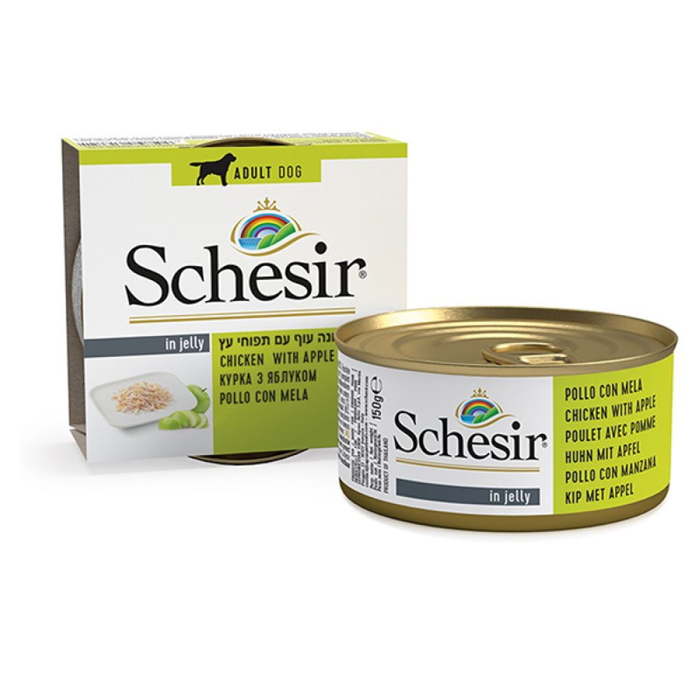 Повноцінний вологий корм Schesir з натуральними куркою та яблуком преміальні консерви для собак. Містить усі необхідні для щоденного раціону поживні речовини, мікро- та макроелементи, вітаміни та таурин. Смачна та корисна страва приготована зі свіжого м'яса курки та яблук. Для приготування корму Schesir використовуються натуральні та екологічно чисті продукти, без додавання штучних барвників і консервантів.