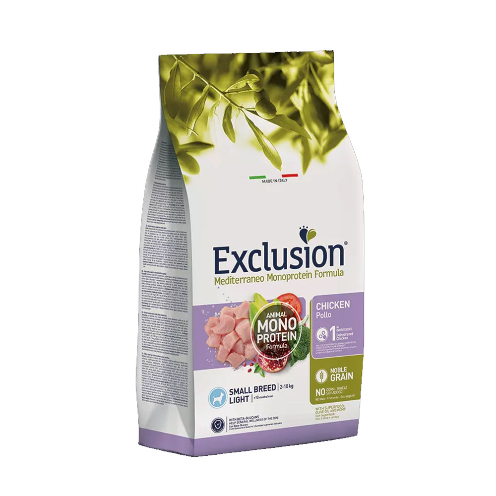 Exclusion Mediterraneo Monoprotein Formula – повнораціонний збалансований корм на основі високоякісного зерна та дегідрованого монопротеїну тваринного походження. Містить тільки натуральні антиоксиданти та β-глюкани. Рецептура корму розроблена в кращих середземноморських традиціях та включає в себе коноплі, оливкову олію, помідори, гранат, броколі та цикорій.
