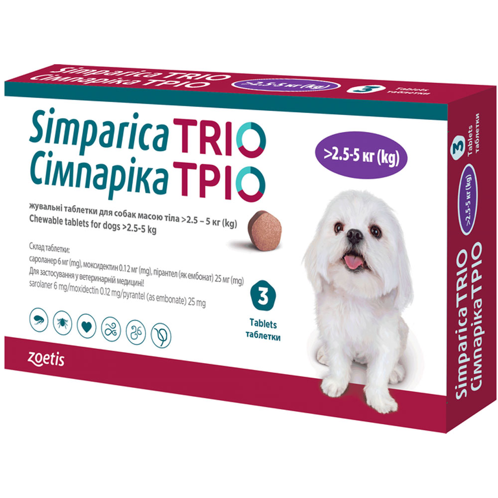 Сімпаріка тріо - жувальні таблетки проти бліх, кліщів та гельмінтів для собак Simparica Trio - таблетки з трьома активними інгредієнтами для захисту від бліх і кліщів, ангіостронгільозу, дирофiлярiозу та шлунково-кишкових нематод. Переваги Simparica Trio: Широкий спектр дії (діє на круглих червів, в тому числі на дирофілярій, заразиться якими тварина може через укуси комарів); Діє до 35 днів, як і стандартна таблетка Сімпаріка; Це дуже безпечний, нехай і комплексний препарат, що підтверджується дослідженнями на собаках, протягом 320 днів; Містить моксидектин, період напіввиведення якого більш тривалий (11 днів), а значить, на відміну від мільбеміцину оксиму (період напіввиведення якого 1,5 дні) захищає від реінвазії мікрофіляріями; Починає вбивати кліщів через 8 годин з моменту прийому; Єдиний жувальний засіб, який вбиває 5 видів кліщів; Запобігає зараженню блохами, вбиваючи бліх ще до того, як вони встигнуть відкласти яйця, починає вбивати бліх протягом 4 годин і досягає 100% ефективності за 8 годин. Склад Сімпарики Тріо: 1 таблетка містить: Для собак вагою 1,25-2,5 кг: сароланер - 3 мг; моксидектин - 0,06 мл; Пірантел (як пірантел ембонат) - 12,5 мг. Для собак вагою 2,5-5 кг: сароланер - 6 мг; моксидектин - 0,12 мл; Пірантел (як пірантел ембонат) - 25 мг. Для собак вагою 5-10 кг: сароланер - 12 мг; моксидектин - 0,24 мл; Пірантел (як пірантел ембонат) - 50 мг. Для собак вагою 10-20 кг: сароланер - 24 мг; моксидектин - 0,48 мл; Пірантел (як пірантел ембонат) - 100 мг. Для собак вагою 20-40 кг: сароланер - 48 мг; моксидектин - 0,96 мл; Пірантел (як пірантел ембонат) - 200 мг. Для собак вагою 40-60 кг: сароланер - 72 мг; моксидектин - 1,44 мл; Пірантел (як пірантел ембонат) - 300 мг. Допоміжні речовини: гіпромелоза, лактози моногідрат, крохмальний гліколат натрію типу А, меглюмін, бутилгідрокситолуол (Е321), пігментна суміш 018 (Е110, Е129, Е132), гідроксипропілцелюлоза, кремнезем колоїдний безводний, стеарат магнію, кукурудзяний крохмаль, кондитерский цукор, глюкоза рідка, порошок свинячої печінки, гідролізований рослинний білок, желатин, зародки пшениці, безводний гідрофосфат кальцію. Загальні відомості: Червонувато-коричневі п'ятикутні таблетки з закругленими краями. Таблетки мають з одного боку тиснення, що вказує кількість сароланеру в таблетці. Зоетіс Сімпаріка Тріо випускають розфасованим по 3 таблетки в блістері. Основні переваги: Захищає собак від дірофіляріозу, кліщів і бліх, аскарид і анкілостом. Всього 1 жувальна таблетка Simparica Trio на місяць забезпечила 100% захист. Постійна активність препарату протягом 28-35 діб. Розширений спектр протипаразитарної дії. Добре переноситься цуценятами (з 8-тижневого віку) і маленькими собаками (більше 1,25 кг). Діюча речовина сароланер - ключовий компонент дерматологічного лікування. Смачні таблетки з приємним смаком, які добре поїдаються собаками. Застосування та дозування: Препарат призначений для перорального застосування. Собака може приймати таблетку як з їжею так і без. Таблетки Сімпаріка Тріо приємні на смак і легко поїдаються більшістю собак, коли їх пропонує власник. Таблетки не потрібно ділити. Препарат слід застосовувати тільки у собак, коли одночасно показано лікування кліщів/бліх і шлунково-кишкових нематод. При відсутності ризику змішаної ко-інфекції слід застосовувати паразитицид більш вузького спектру дії. У ендемічних районах собаки повинні отримувати профілактичні процеду