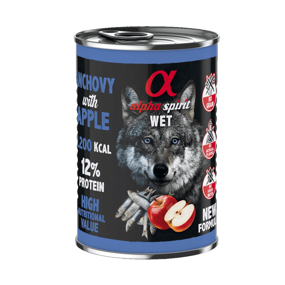 Вологий корм Alpha Spirit Anchovy With Red Apple готується з використанням єдиного джерела протеїну - з анчоусів (93%), з додаванням маленьких шматочків свіжих червоних яблук.