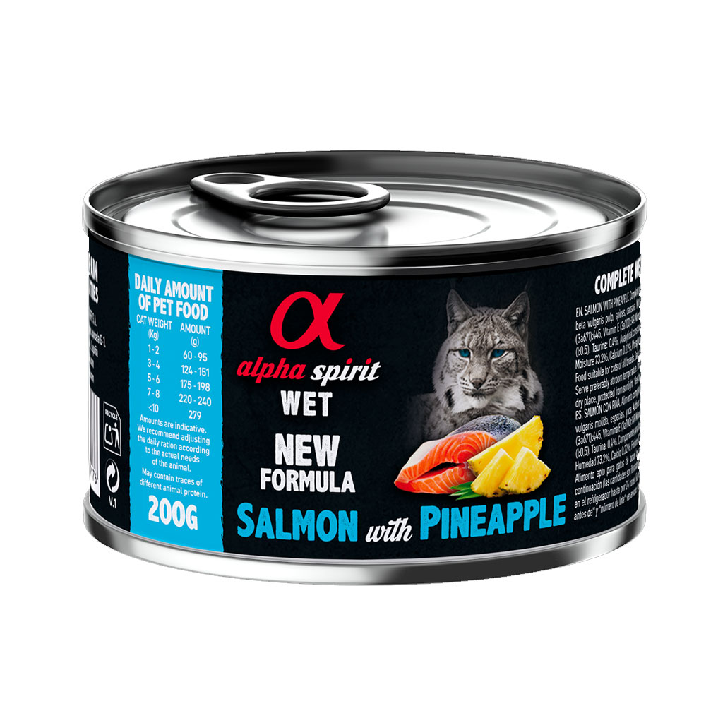 Вологий корм Alpha Spirit Salmon with Pineapple для дорослих котів готується з інгредієнтів преміальної якості та добавкою таурину, де єдиним джерелом протеїну – є лосось (93%).