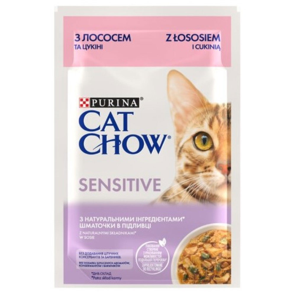 Паучі Cat Chow Sensitive з лососем та кабачками в соусі регулюють роботу шлунково-кишкового тракту, забезпечують кішку необхідною кількістю білків, вуглеводів та корисних жирів. Клітковина із овочів нормалізує мікрофлору кишечника. Додатково консерви збагачені цінними мікроелементами, а також вітамінами А та D3.