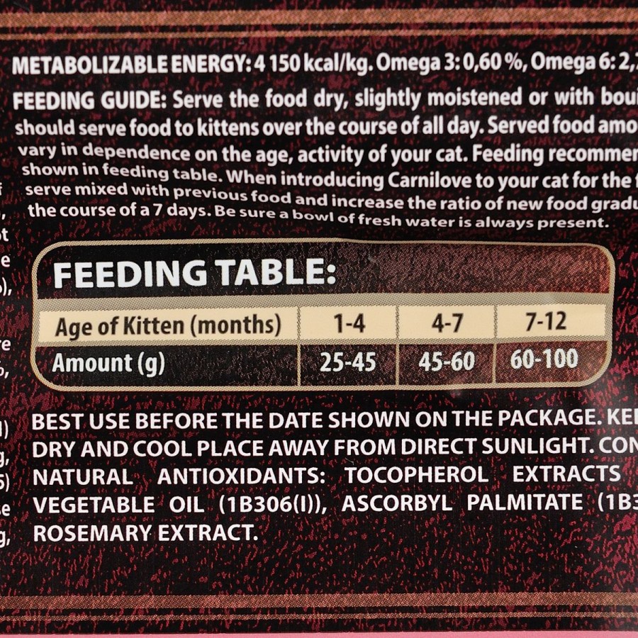 Енергетична цінність: 4 150 ккал/кг, Омега-3: 0,60%, Омега-6: 2,70%.