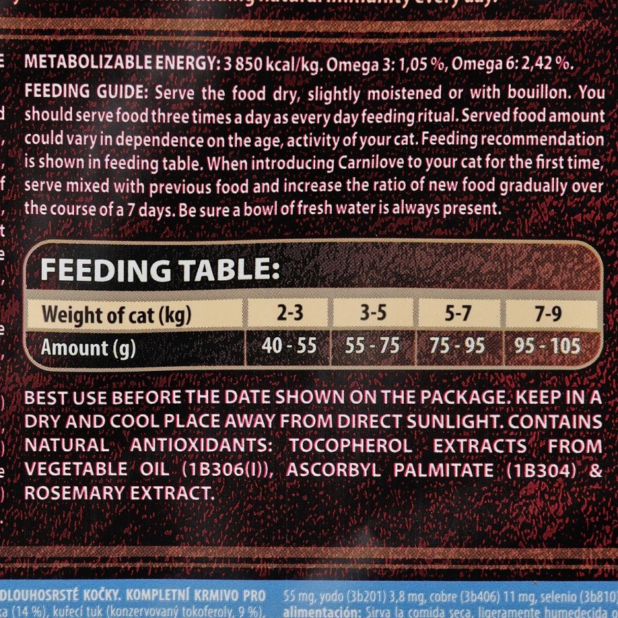 Енергетична цінність: 3 850 ккал/кг, Омега-3: 1,05 %, Омега-6: 2,42 %.