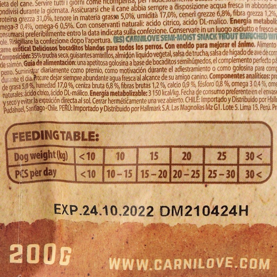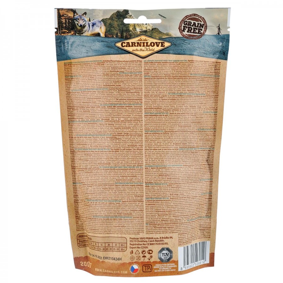 Carnilove Semi-Moist Trout enriched with Dill – напіввологі беззернові ласощі з фореллю і кропом для собак. Спокушають улюбленців своїм екзотичним смаком, а особливий склад снеків сприяє гарному настрою собак.