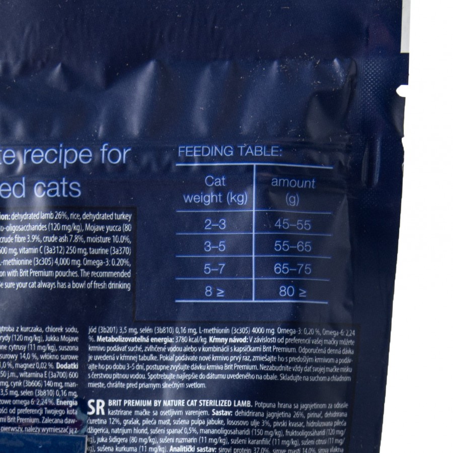 Харчові добавки на 1 кг: вітамін А (3a672a) 20000 МО, вітамін D3 (3a671) 850 МО, вітамін E (3a700) 600 мг, вітамін C (3a312) 250 мг, таурин (3a370) 2150 мг, біотин (3a880) 1,7 мг, цинк (3b606) 140 мг, марганець (3b504) 50 мг, залізо (3b106) 50 мг, мідь (3b406) 10 мг, йод (3b201) 3,5 мг, селен (3b810) 0,16 мг, L-метіонін (3c305) 4000 мг. Омега-3: 0,20%, Омега-6: 2,24%.